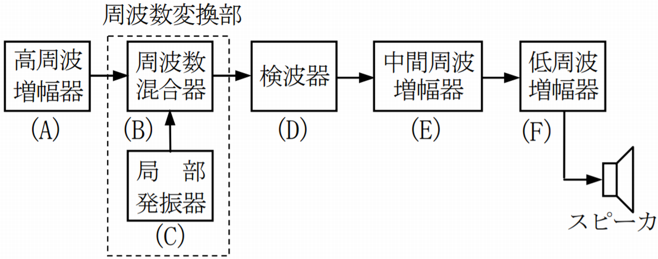 図に示す AM(A3E)用スーパヘテロダイン受信機の構成には誤った部分がある。これを正すにはどうすればよいか。